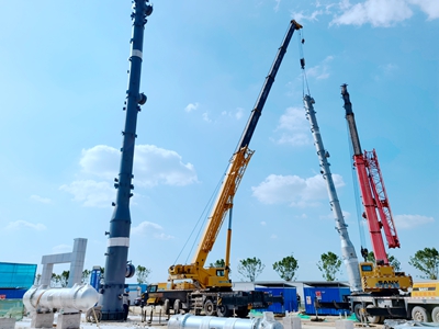 據悉,此次吊裝吸收塔和再生塔是本項目脫酸單元的核心設備,為確保本次吊裝的平穩有序推進,項目組積極與咸陽禮泉縣道路運輸管理部門、供貨商、施工方等各方對接,確定了發貨時間、運輸路徑,并嚴格篩查相關人員行程軌跡,確保吸收塔和再生塔的順利進場。隨后及時進行設備驗收,同時督促施工方制定并優化吊裝方案,確保吊裝機具到位,將吸收塔和再生塔成功吊裝到位。