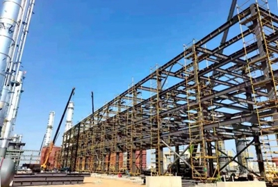 甲醇聯合裝置鋼結構約7100噸。目前,甲醇裝置管廊、精餾框架、變換框架、凈化壓縮機廠房鋼結構已全面開始安裝,累計完成安裝2600余噸。(通訊員/衣成波 攝/衣成波)