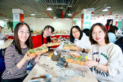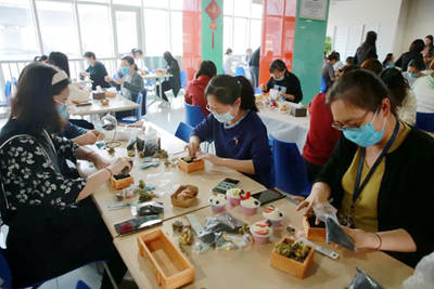 在下午開展的手工制作微景觀植物活動中,讓女職工顯露出動手的天賦。工作人員事先準備了制作微景觀多肉植物的相關材料,如玻璃瓶、木盒、繁殖土、鋪面石、裝飾砂石、擺件等,大家將不同種類的多肉植物搭配在一起,填土、配色、種植、鋪面,不一會,一盆盆精美的盆栽爭奇斗艷,大家分享經驗,交流養護心得,釋放了壓力,舒緩了心情。
