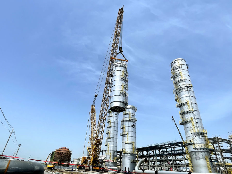 乙醇精制塔上塔的順利封頂,吹響了大件吊裝沖鋒的號角,向4月底大件吊裝全面收官的目標邁出堅實的一步。(通訊員/黃耀輝 攝/王超)