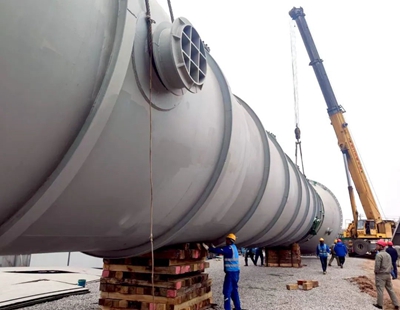 作為項目的關鍵設備,電子級乙醇塔直徑達4.8米,高度約110米,總重約450噸;脫輕塔和脫重塔長度均超過60米,屬超限設備,需分段運輸并在現場組對安裝。為確保設備安全卸車,項目組精心策劃,采用300噸+250噸雙機抬吊方案,并在吊裝前嚴格進行設備檢驗、安全交底及聯合檢查,順利完成超限設備短駁任務。