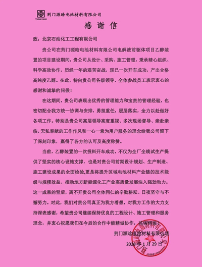 1月26日,北京石油化工工程有限公司(簡稱:北油工程)總承包的荊門源晗乙醇裝置一次性開車成功,順利產出合格高純度乙醇,標志著該項目建設任務圓滿收官、實現階段性重大突破。荊門源晗特向北油工程發來感謝信,對公司各級領導及項目團隊在裝置建設期間的傾力支持、卓越管理和辛勤付出,致以衷心感謝與誠摯問候。